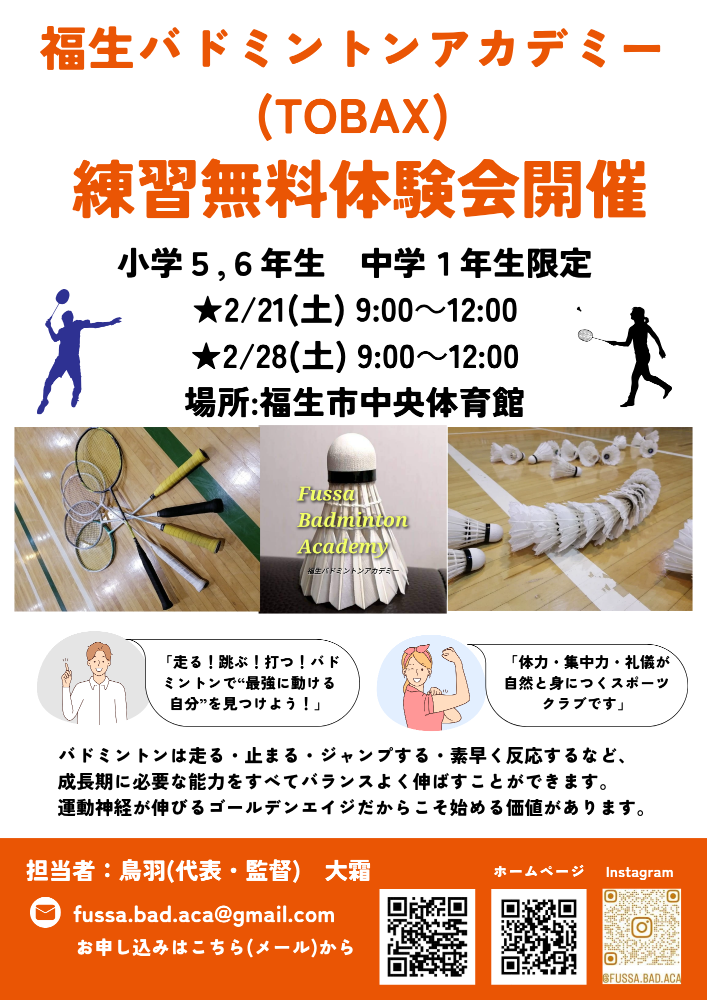 福生バドミントンアカデミーでは随時新メンバーを募集します。
